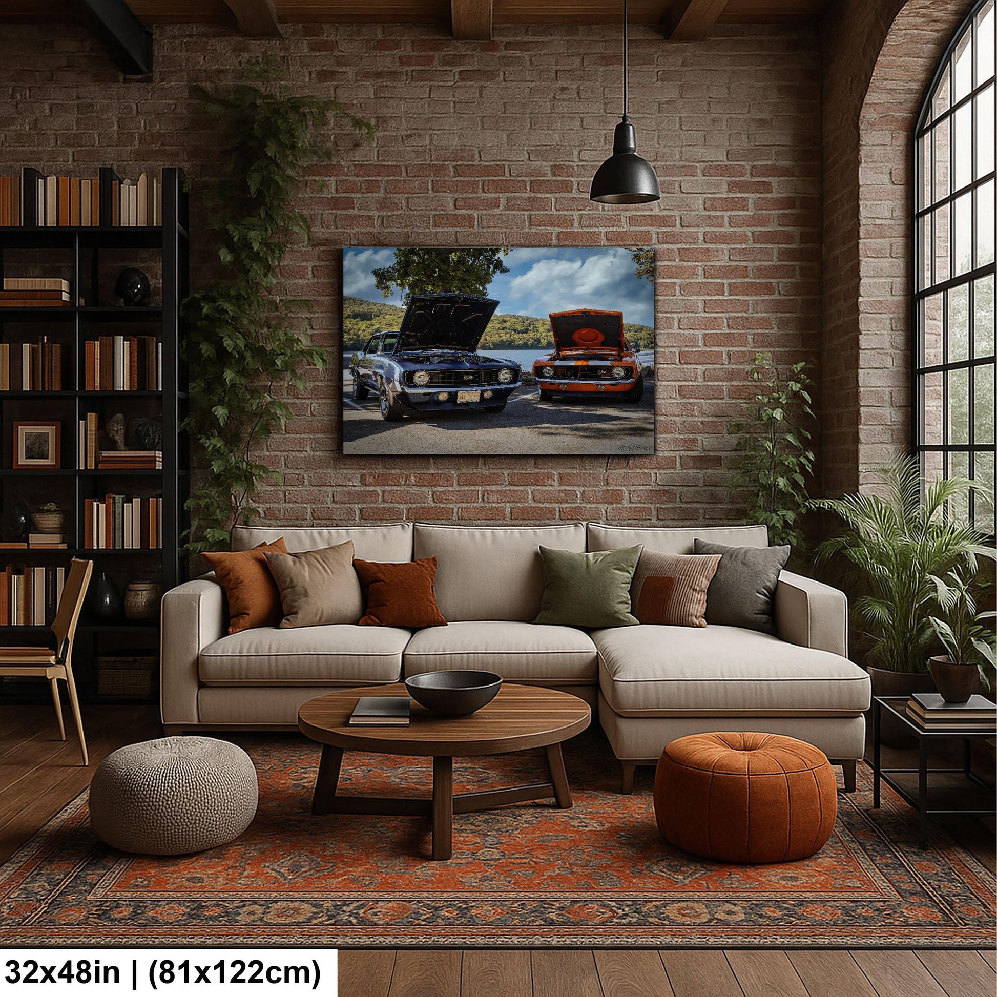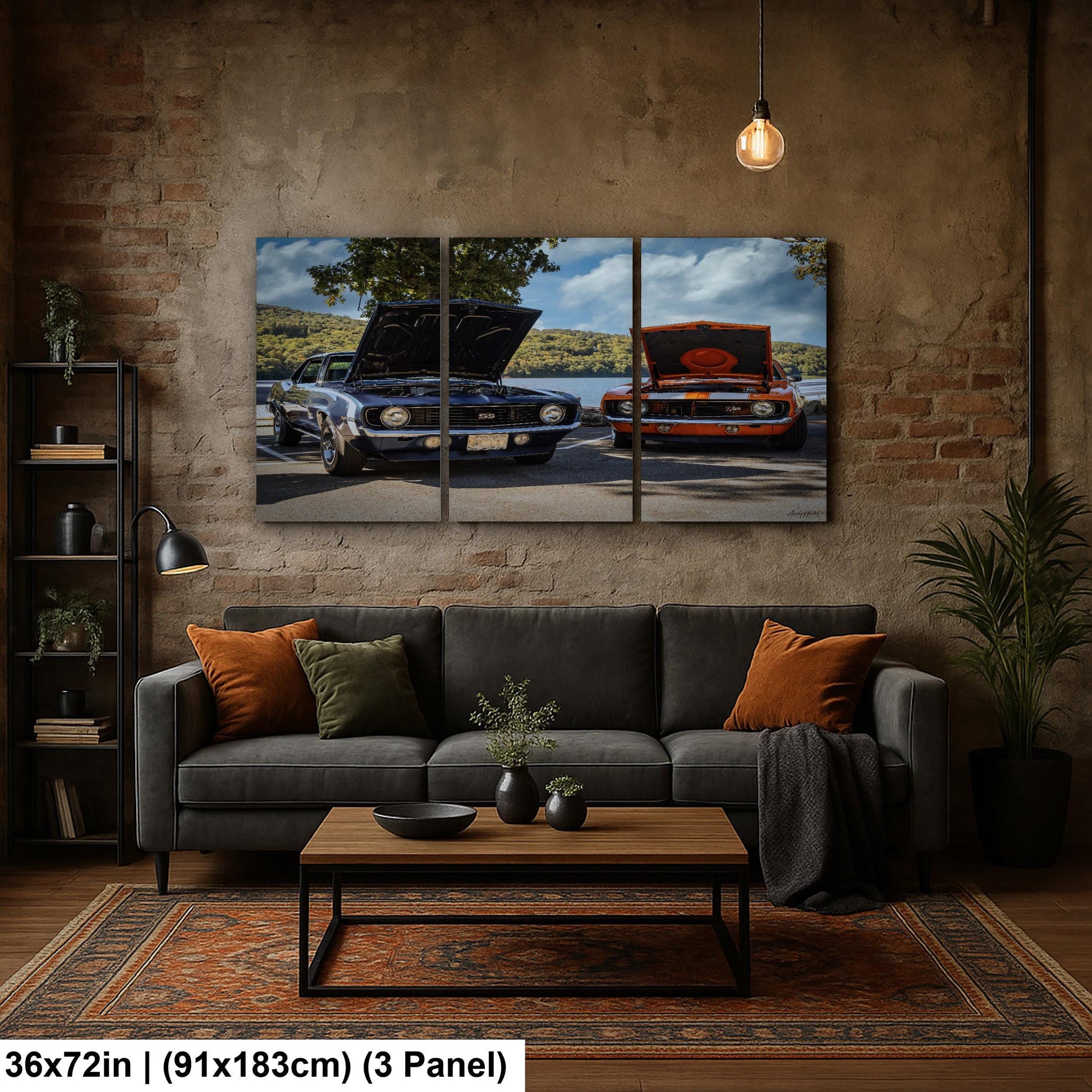 The 1969 Big Block SS Camaro and 1969 Camaro Z28 capture the essence of Chevy muscle cars in this striking scene by the river. These classic Camaro models showcase American muscle legends at their peak, delivering raw power and timeless design that enthusiasts cherish. Featuring a big block V8 engine, the SS Camaro roars with authority, while the 1969 Camaro Z28, built for the SCCA Trans-Am series, boasts precision engineering and high-revving performance. This muscle car photography piece highlights vintage Chevy cars framed against the shimmering Hudson River, celebrating iconic Camaro body lines and the spirit of speed.