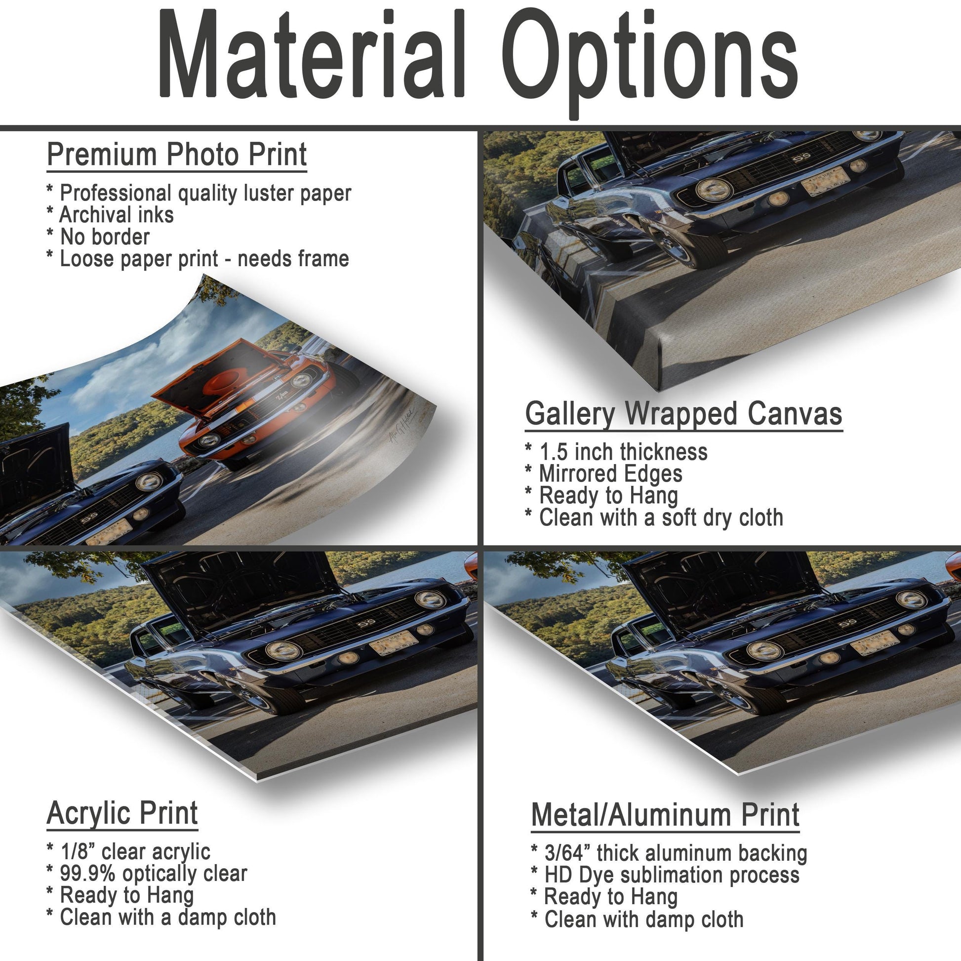 This photograph not only captures legendary muscle cars but also supports a meaningful cause—proceeds contribute to veterans’ groups in honor of those who have served. With free shipping and Etsy's carbon offsetting on packaging and delivery, this purchase is both responsible and inspiring.
