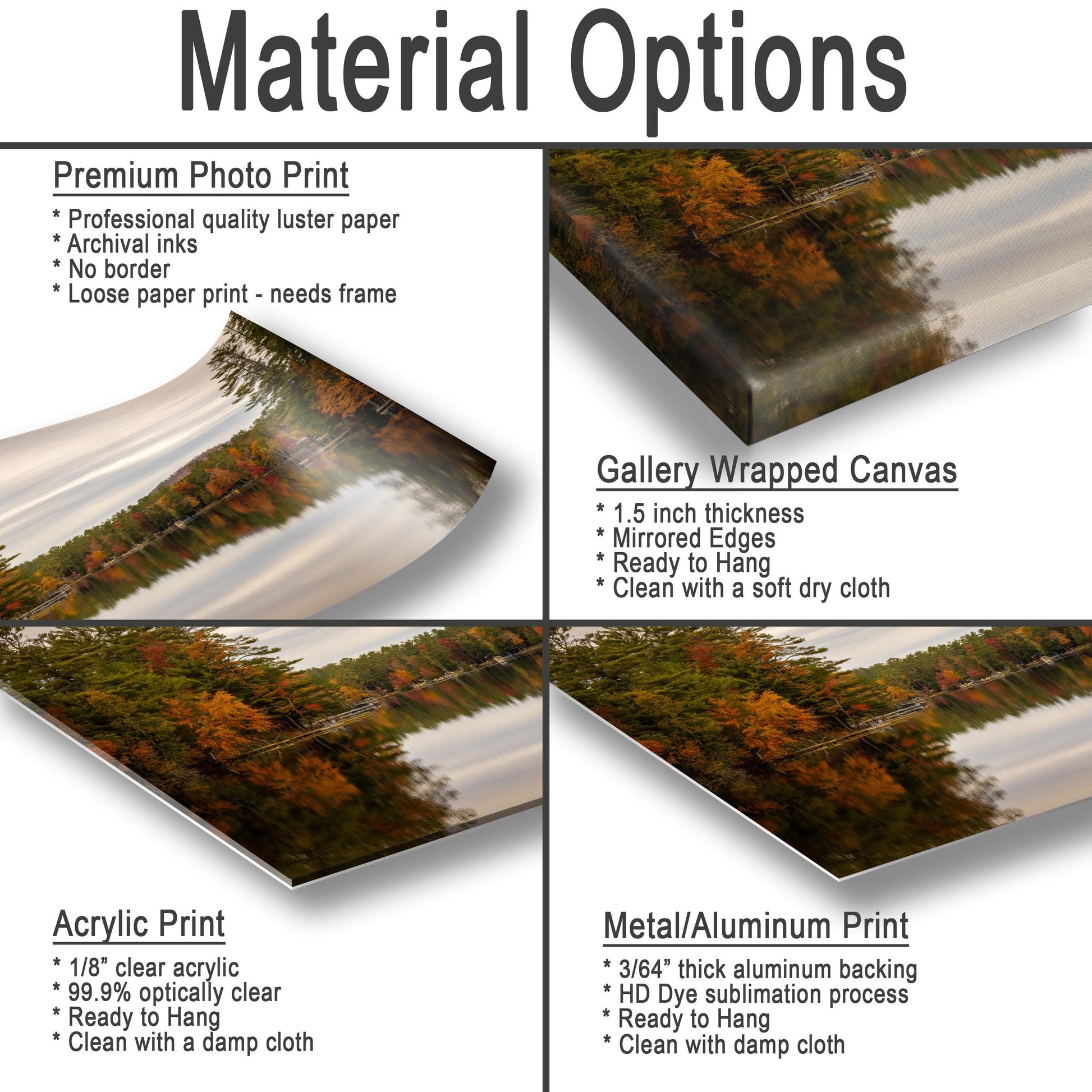 This Adirondack metal print captures the serene beauty of Loon Lake with vibrant color and crisp detail, making it the perfect Adirondack metal print for mountain wall art enthusiasts seeking stunning lake view decor. Crafted on a glossy aluminum panel, this metal photo print features UV resistant ink that preserves the rich fall colors artwork and ensures long-lasting vibrancy. Measuring 16x20 inches with a 3/64" thickness and rounded edges, this glossy aluminum print is ready to hang right out of the box, providing an elegant and durable addition to your rustic cabin decor or nature landscape art collection.