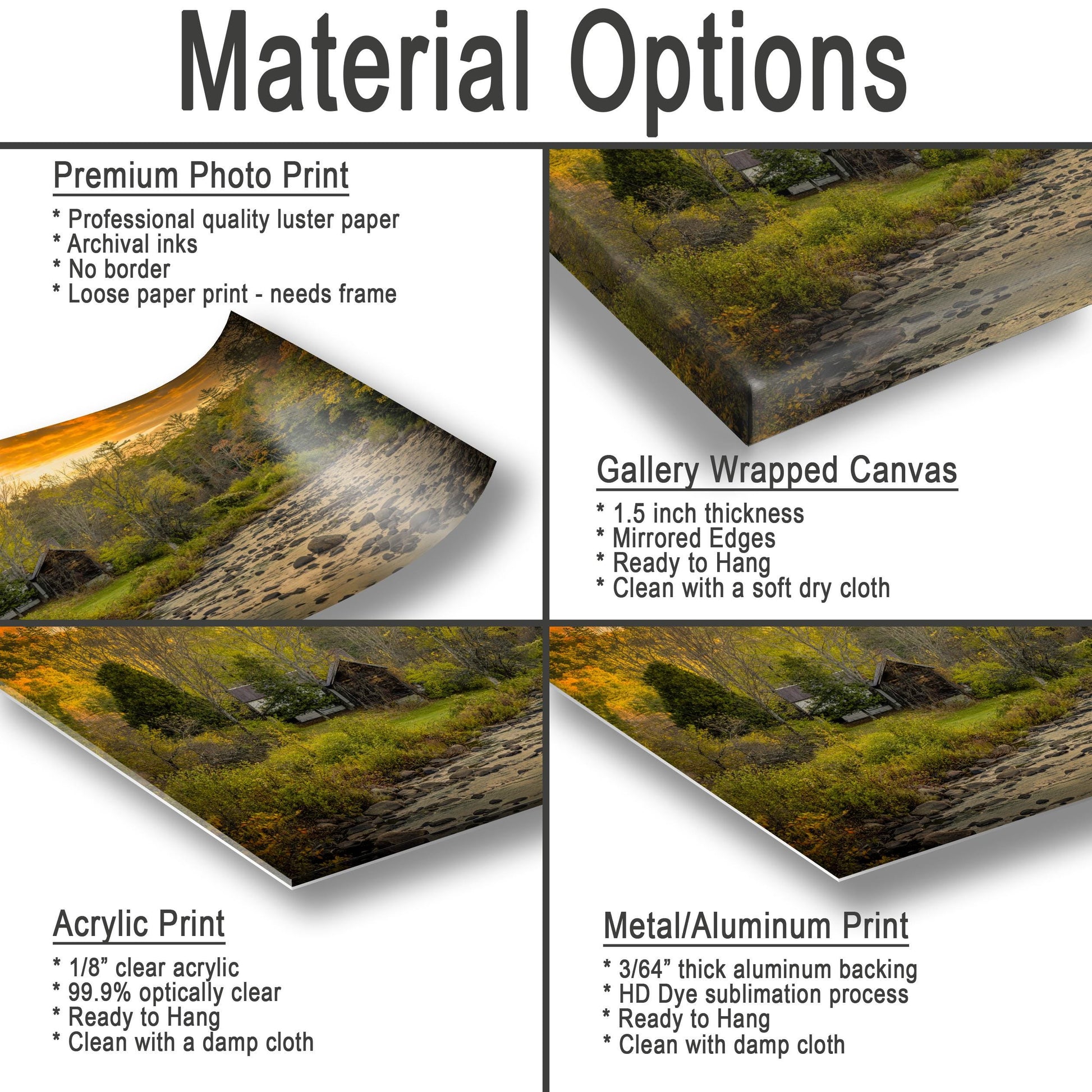 Each piece of Hudson River photography is produced with precision to deliver vivid colors and sharp details. The ready to hang canvas features 1.5-inch thick wooden stretcher bars with no visible staples or edges, ensuring a polished finish straight out of the box. Our aluminum metal prints use UV-resistant ink on 3/64" thick panels with rounded edges, providing durability and a glossy coating that resists fading over time. Acrylic photo prints offer museum-quality clarity with .22" thick clear acrylic that refracts light for vibrant depth and brilliance.