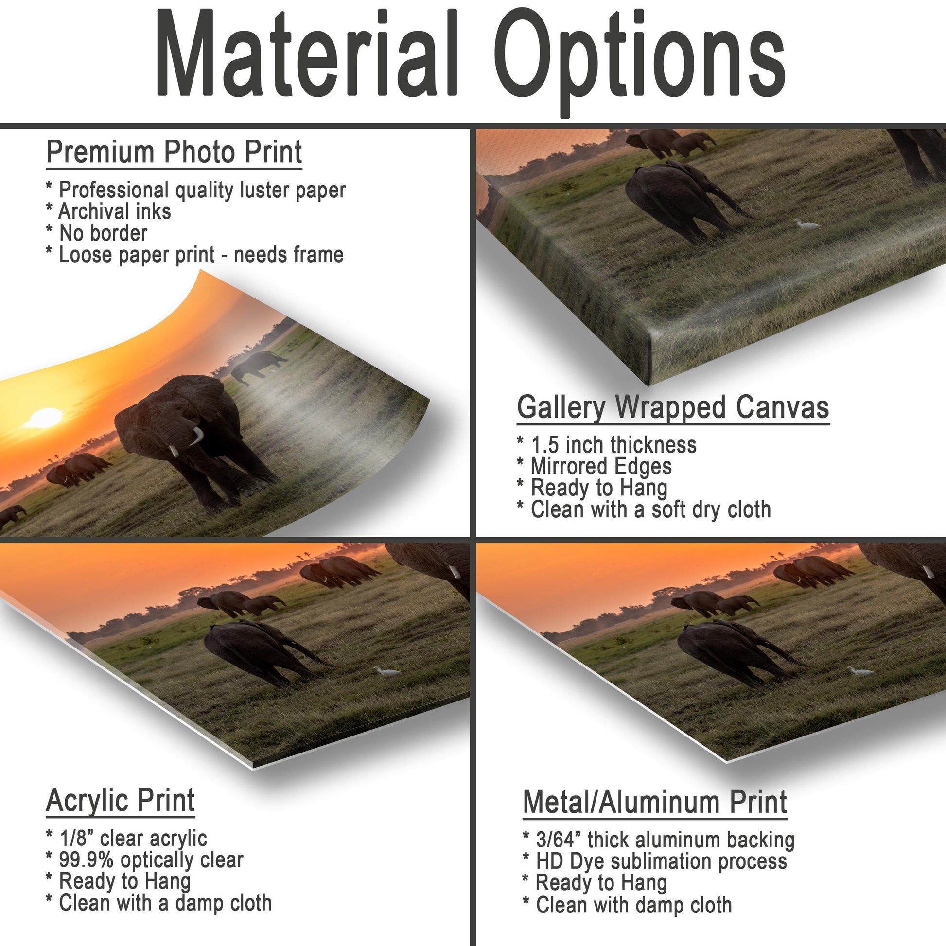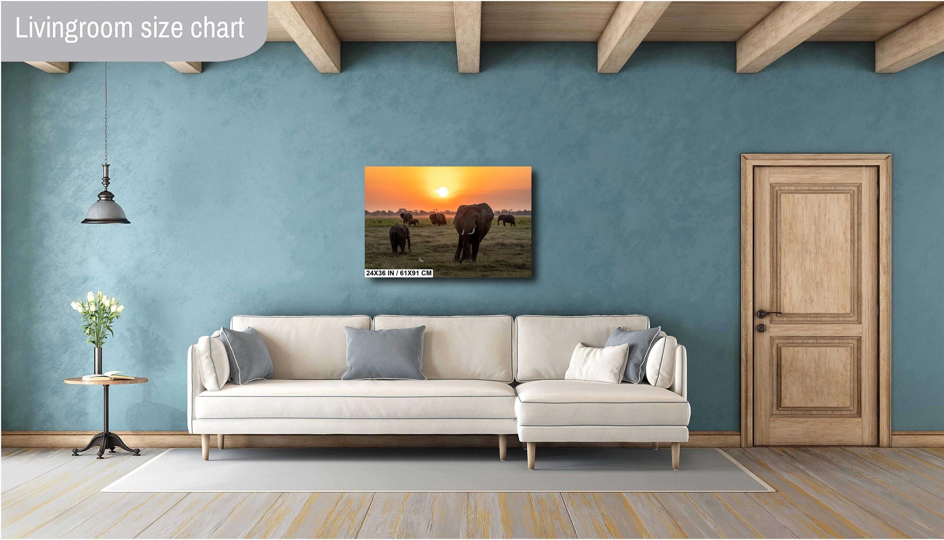 This African sunset elephant print captures a majestic elephant herd silhouetted against the glowing savannah sky, offering a stunning Kenya safari wall art piece that transforms any space with authentic wildlife canvas art. Measuring up to 16x20 inches on premium glossy photo paper or ready-to-hang canvas, this safari animal silhouette brings the vibrant savannah sunset decor into your home or office. Each print showcases the intricate details of an elephant tusk image and the vast Kenyan safari landscape, making it a perfect addition for lovers of big five animal art and luxury wildlife decor.