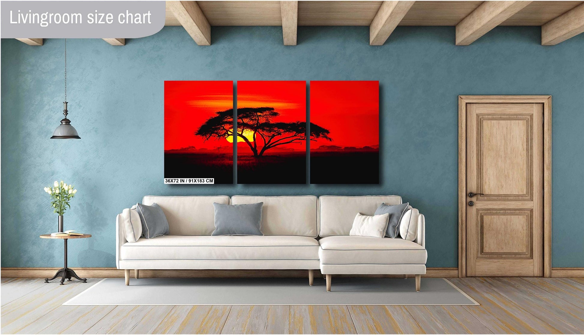 Crafted with premium materials, your options include glossy photo paper, metal photo print, vibrant acrylic prints, and aluminum metal prints—all designed to preserve the vivid sunset safari print and acacia tree artwork with UV resistant inks that prevent fading. The ready to hang canvas features 1.5-inch thick wooden stretcher bars with no visible staples or edges, ensuring a polished look straight out of the box. Choose from single-panel canvases or dramatic triptych canvas panels for a modern presentation.