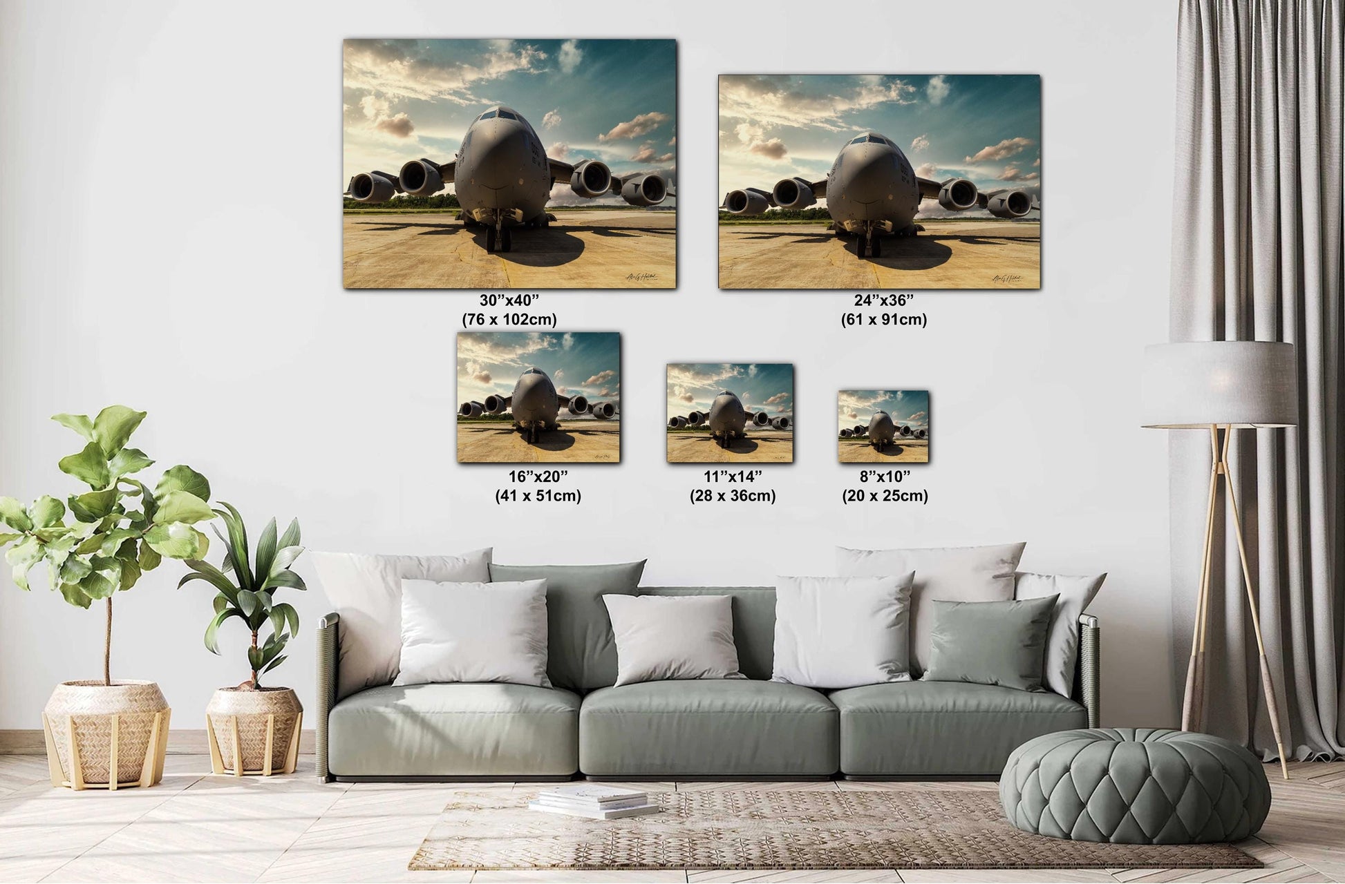 This military cargo artwork measures precisely to fit your space, available in multiple formats including premium glossy photo paper prints (8x10, 11x14, 16x20 inches), ready-to-hang canvases with 1.5-inch thick wooden stretcher bars, split three-panel canvases for a dramatic modern look, aluminum metal prints with UV resistant ink, and vibrant acrylic prints that refract light for stunning image depth. Each option is crafted to highlight the C-17’s massive scale and rugged design, perfect for collectors and enthusiasts of USAF wall decor.