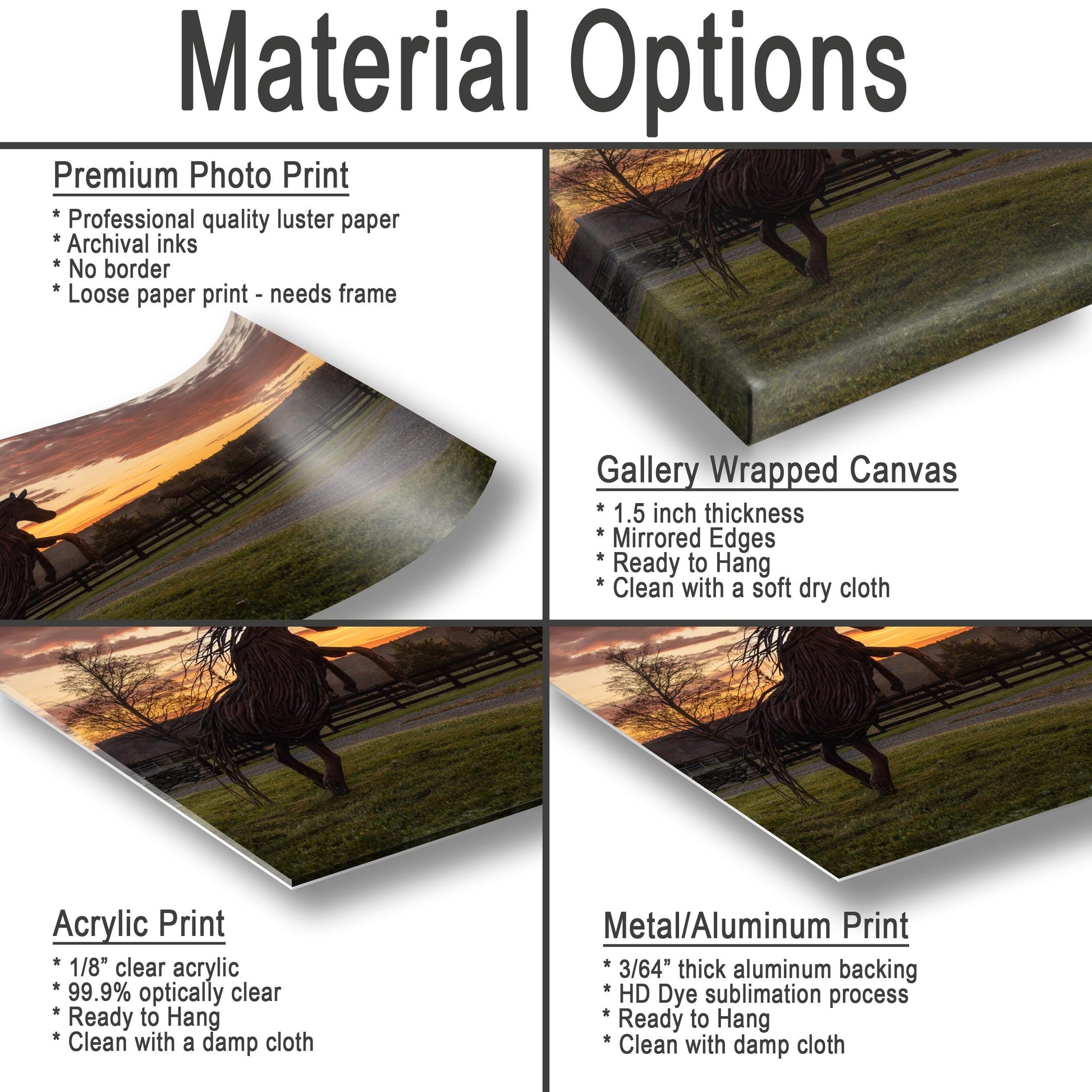 - Aluminum Metal Prints feature UV-resistant ink on a 3/64" thick panel with glossy coating and rounded edges.