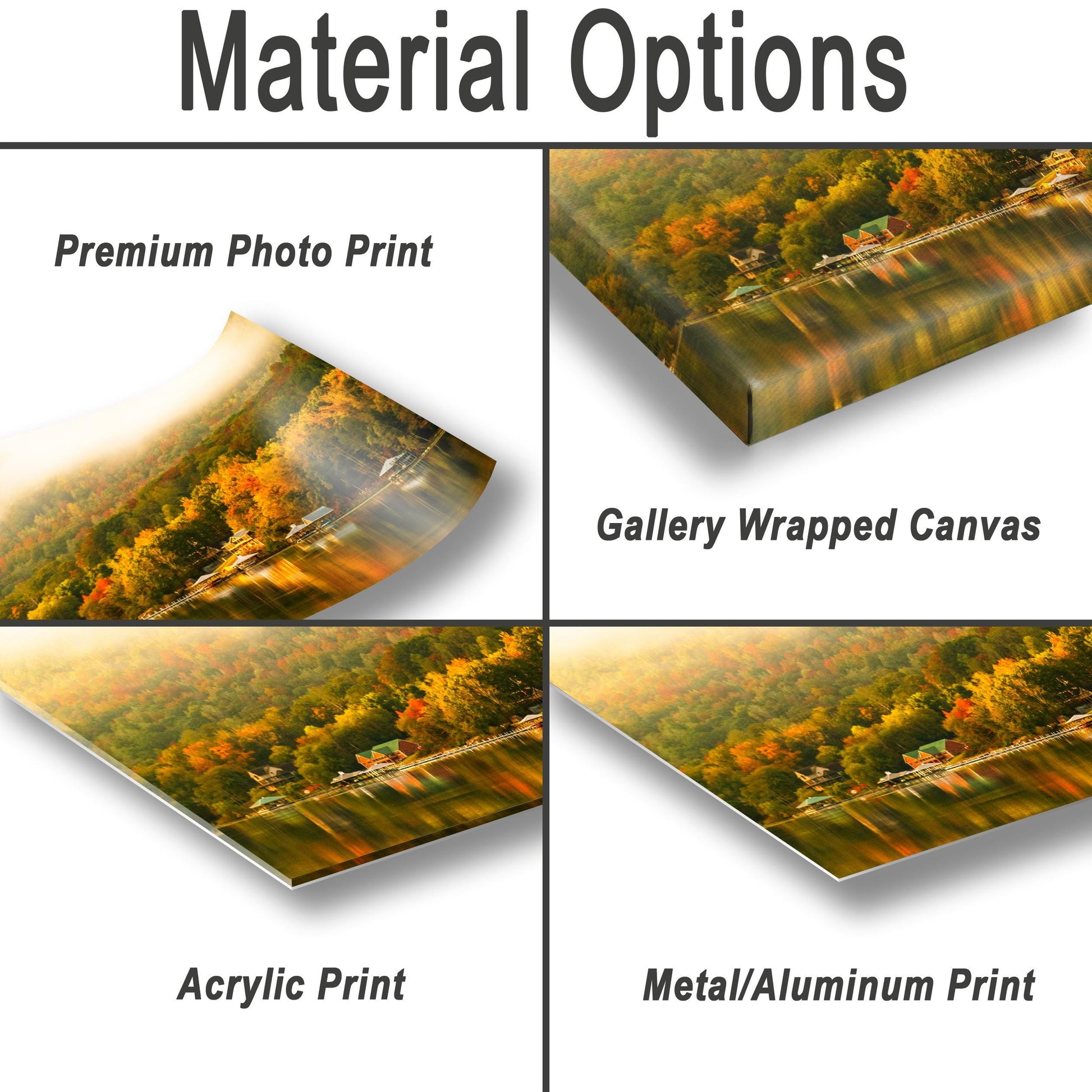 Enhance your living room, office, or gallery wall with this stunning mountain landscape print that captures the essence of fall along the Tennessee River. Whether you prefer the classic look of glossy photo paper or the modern appeal of aluminum metal prints or acrylic displays, this collection offers versatile options to fit your décor style.
