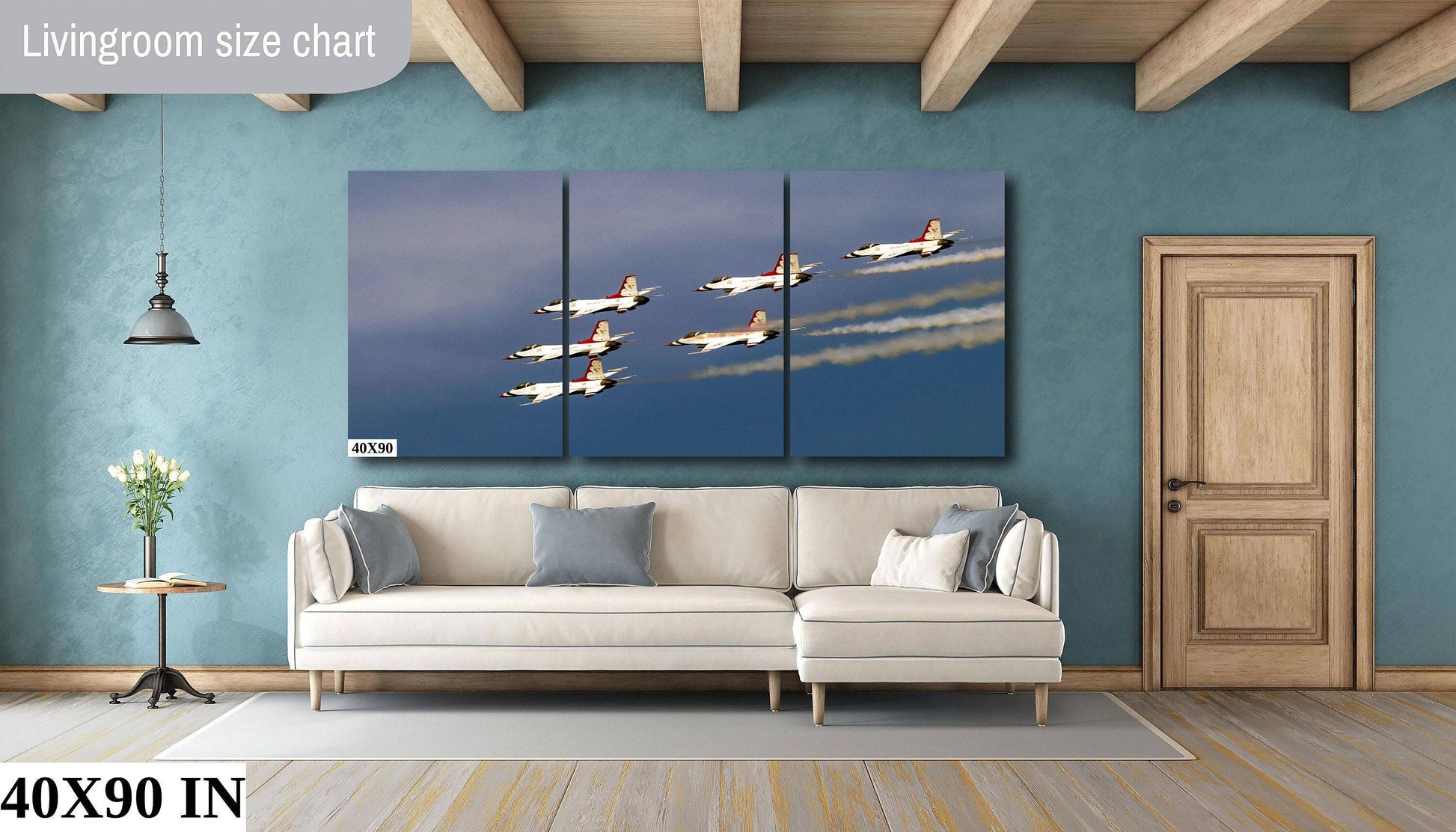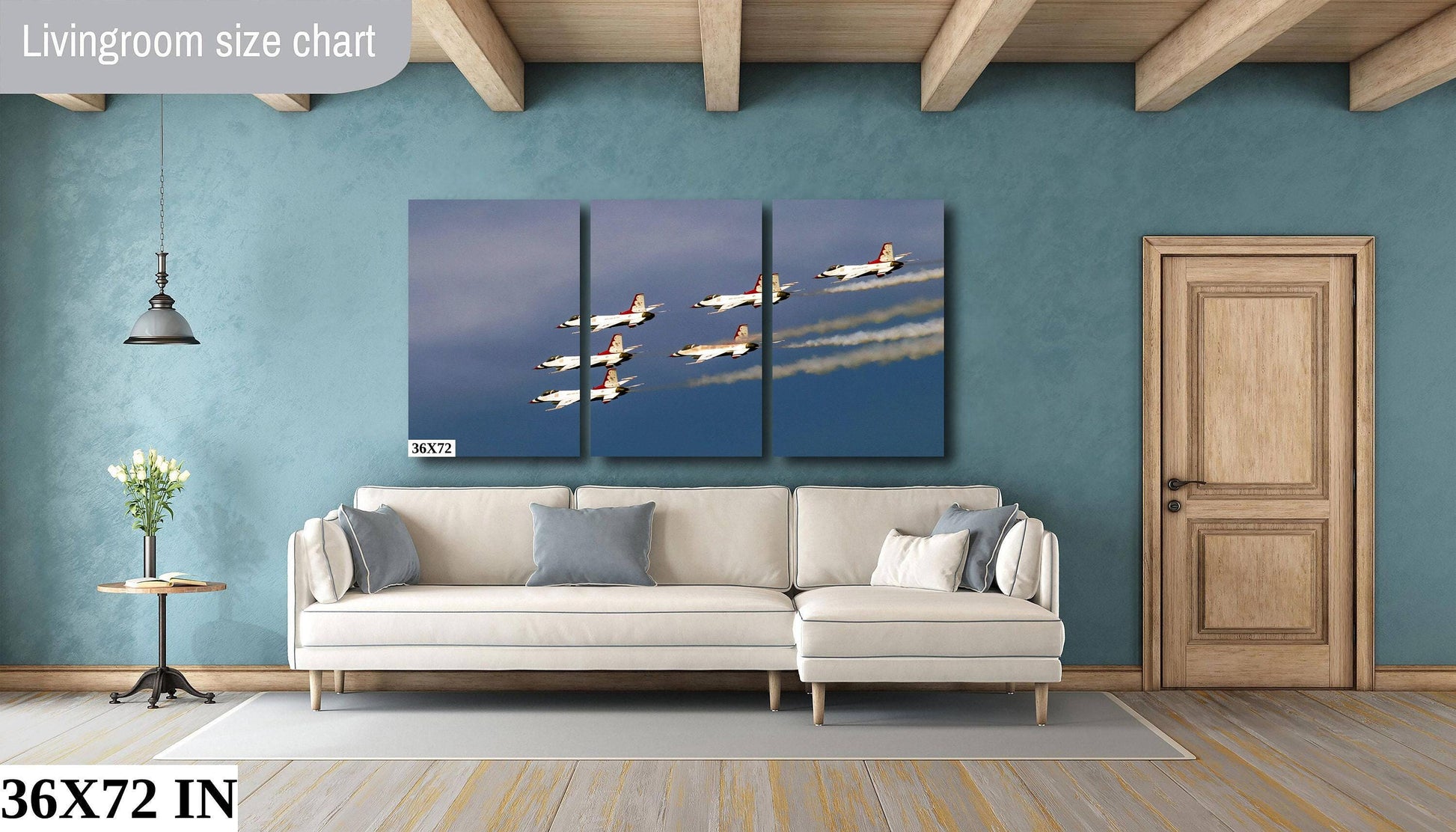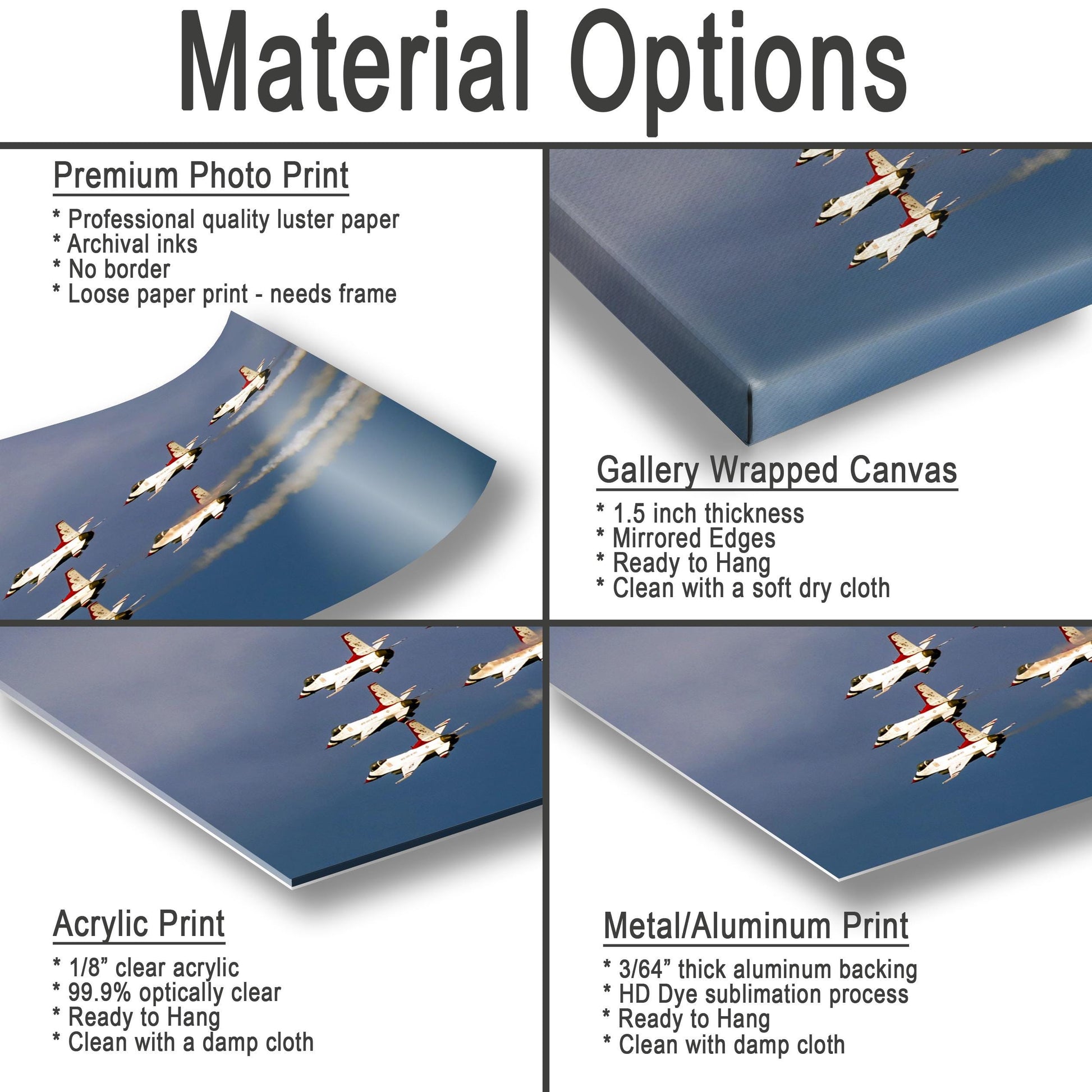 Printed on premium glossy photo paper or available as a ready to hang canvas, this airshow photography piece offers sharp, vivid colors that preserve every detail of the flight. The glossy photo paper option is available in 8x10, 11x14, and 16x20 inches, designed to be framed for lasting display. The ready to hang canvas features 1.5 inch thick wooden stretcher bars with no visible staples or edges, providing a polished and professional look right out of the box. For larger spaces, choose the three-panel canvas split that adds a modern artistic touch.