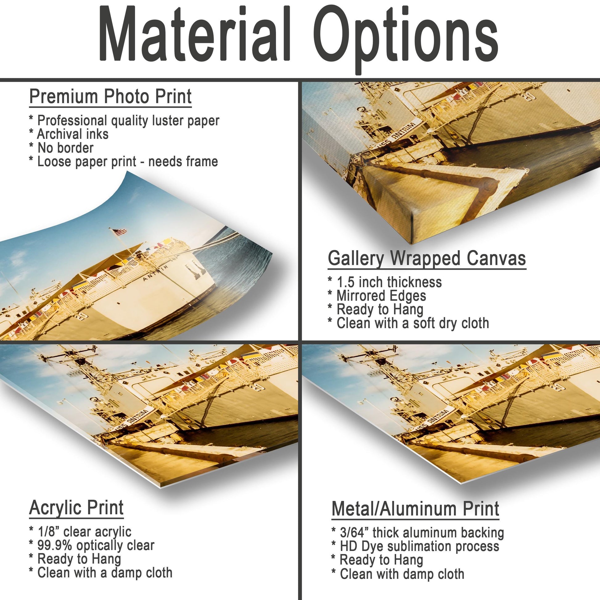 Additional options include durable aluminum metal prints featuring UV resistant ink on a 3/64" thick panel with rounded edges, ready to hang straight from the box. Modern acrylic prints offer vibrant color depth through .22" thick museum-quality acrylic with UV protection to prevent fading.