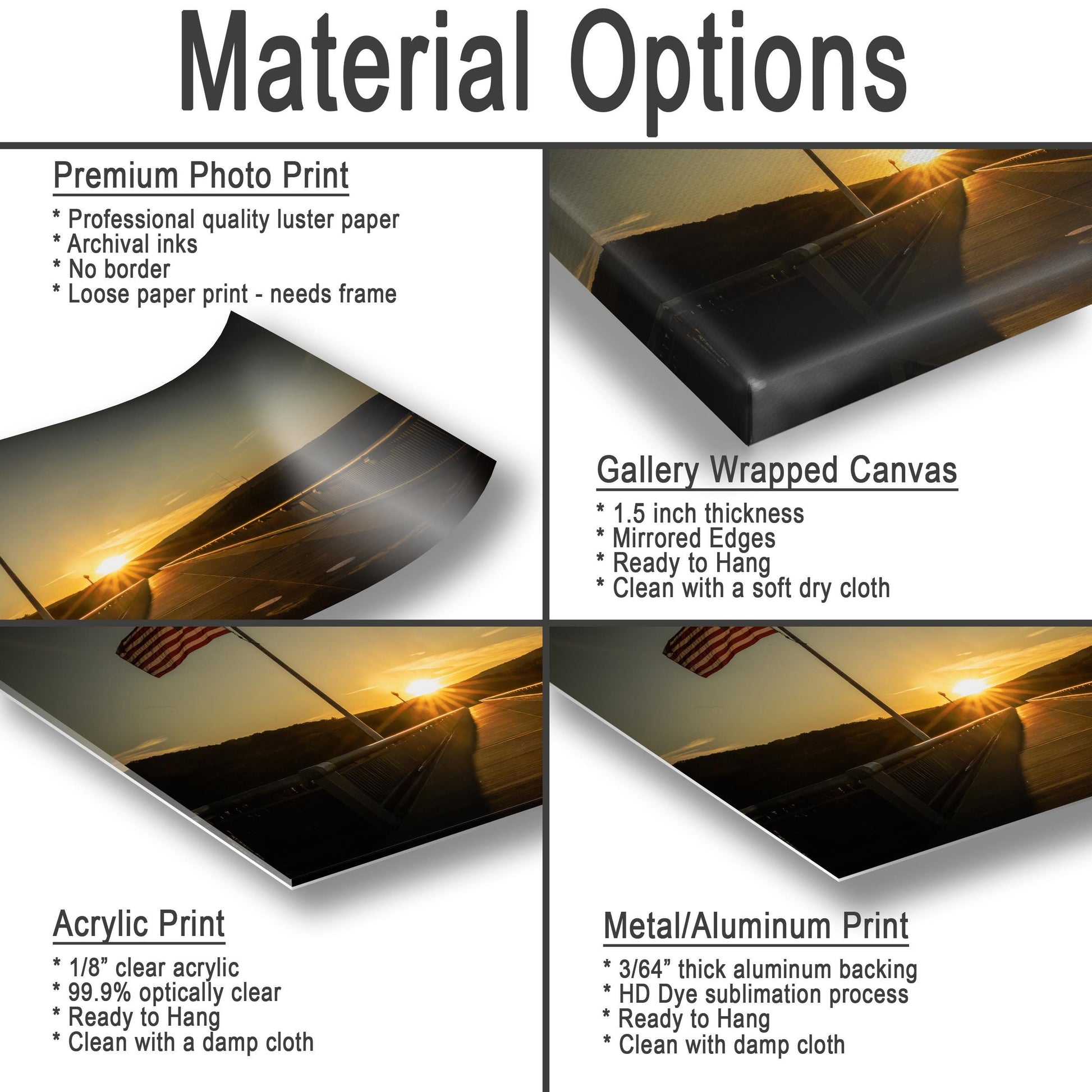 - Aluminum Metal Prints: Sleek, glossy metal panels with UV-resistant ink for lasting brilliance and durability.